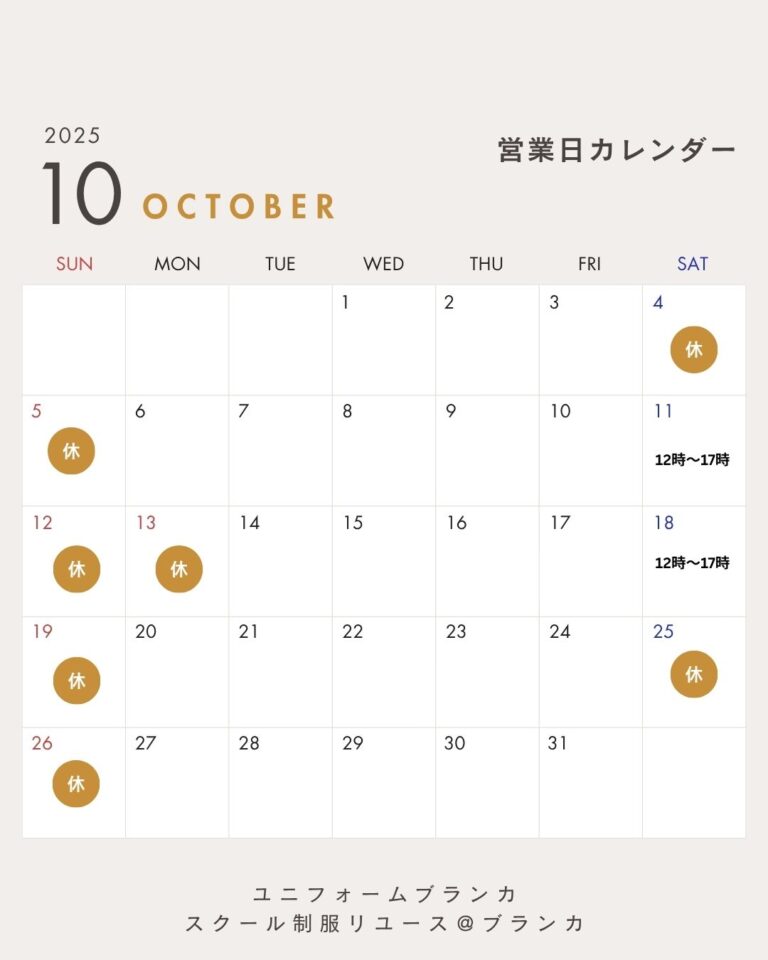 ユニフォーム・ブランカ スクール制服リユース@ブランカ 営業日のお知らせです。